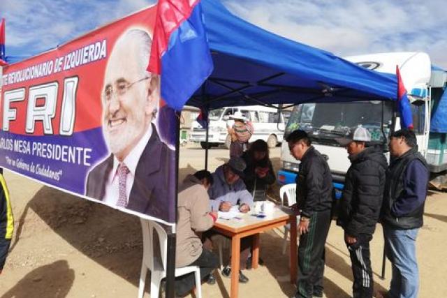 El Frente Revolucionario de Izquierda (FRI), cuyo andidato presidencial es Carlos Mesa, informó que presentará una protesta ante el Tribunal Supremo Electoral (TSE) por la actitud violenta de los militantes del Movimiento al Socialismo (MAS), el partido de Gobierno, que evitaron la inscripción de militantes en el FRI. Además presentarán una denuncia ante la Organización Internacional de Trabajo (OIT).