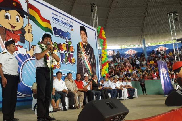 Con un acto desarrollado en el Coliseo Andrés Ibáñez de Montero, el presidente del Estado boliviano, Evo Morales, dio inicio hoy al pago del bono ‘Juancito Pinto’.
