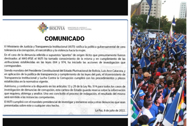 “En el caso de la denuncia referida a supuestos “aportes” de origen ilícito que presuntamente fueron destinados al MAS-IPSP, el Ministerio de Justicia ha tomado conocimiento de la misma y en cumplimiento de las atribuciones establecidas en las leyes 004 y 974, ha iniciado las acciones de investigación que corresponden. Siendo mandato del presidente constitucional del Estado Plurinacional de Bolivia, Luis Arce Catacora, y en aplicación de la política de transparencia y cumplimiento de las leyes del país, el Viceministerio de Transparencia Institucional y Lucha Contra la Corrupción cumplirá con los procedimientos y plazos establecidos en la normativa vigente”, informó esa Cartera de Estado.