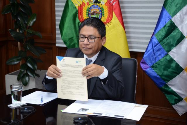 El ministro de Justicia y Transparencia Institucional, Iván Lima, y la secretaria General de la Organización Iberoamericana de Seguridad Social (OISS), Gina Magnolia Riaño, firmaron este martes un acuerdo interinstitucional internacional sin obligación financiera para el asesoramiento técnico en relación a los derechos de las personas adultas mayores.