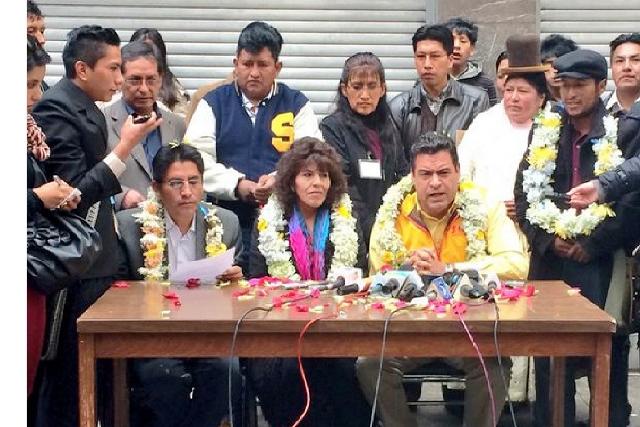 La postulante estuvo acompañada por el candidato a la Gobernación de La Paz por esa organización política, Felix Patzi, y el líder de la sigla, Luis Revilla.
