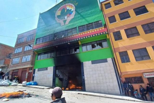 “La Defensoría del Pueblo lamenta los excesos durante la marcha cocaleros que ha derivado en daños a la infraestructura del denominado Mercado de la Coca de Villa el Carmen que se encuentra en llamas, que podrían propagarse y afectar el centro de salud que colinda y otros edificios, por lo que urge la presencia de la Unidad de Bomberos”, señala la entidad defensorial.