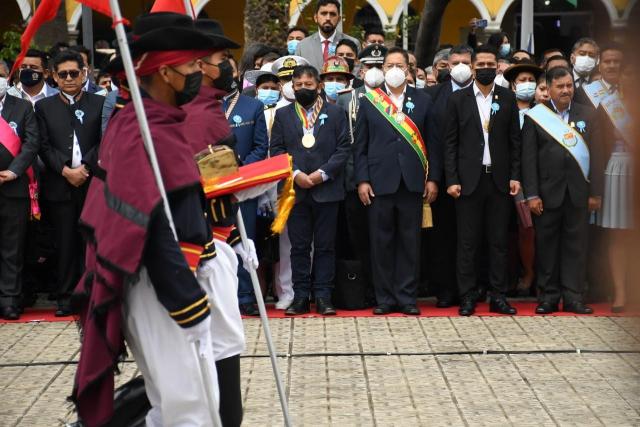 En el acto, el presidente Luis Arce Catacora, junto con el vicepresidente David Choquehuanca, el gobernador Humberto Sánchez y el alcalde Manfred Reyes Villa entonaron juntos el himno nacional mientras realizaban la iza de las enseñas nacionales y departamentales.
