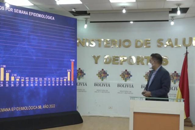 “Esta semana se han reportado 13.289 casos, son 7.210 casos más que la semana pasada, significando esto un incremento a nivel nacional de 119 por ciento respecto a la semana anterior. Esta semana se registran 13 decesos. Es la sexta semana de incremento de casos en el marco de la sexta ola epidemiológica”, señaló el ministro de Salud y Deportes, Jeyson Auza, en la conferencia habitual de los lunes.