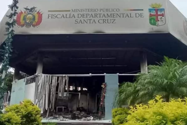 Entre los destrozos, resaltó la quema de la infraestructura de la Fiscalía Departamental de Santa Cruz. El fuego ocasionó daños “al equipamiento tecnológico, bienes muebles e inmuebles, y cuadernos de investigación, inclusive afectación a los bienes privados de las y los servidores públicos, así como la puesta en riesgo de la integridad física del personal que se encontraban en las instalaciones”, informó el Ministerio Público.