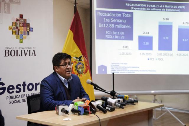 Indicó que desde septiembre de 2022 hasta mayo de 2023 se recaudó un total de Bs 63,6 millones, de los cuales Bs 53,18 millones corresponden al fondo de ahorro de pensiones, y Bs 10,4 millones al fondo solidario.