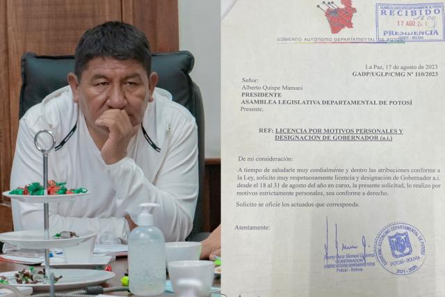 “(…) Solicito muy respetuosamente licencia y designación de Gobernador a.i. desde el 18 al 31 de agosto del año en curso, la presente solicitud, lo realizo por motivos estrictamente personales, sea conforme a derecho”, señala la nota firmada por Mamani.