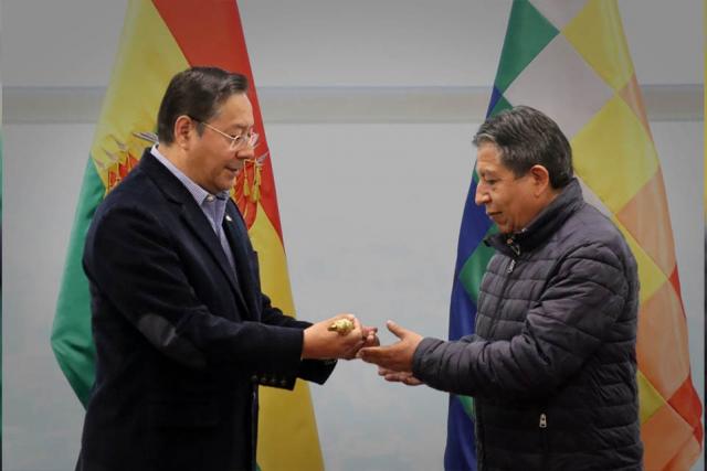 El presidente Luis Arce entrega el Bastón de Mando del país al vicepresidente David Choquehuanca.