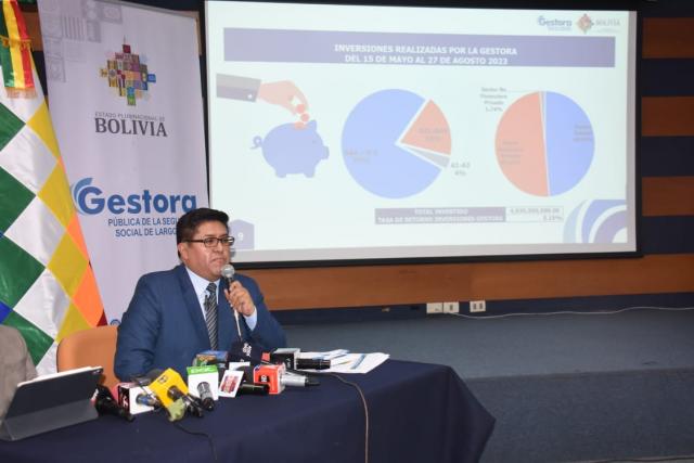 Precisó que las inversiones que hizo la Gestora Pública entre el 17 de mayo y 28 de agosto de este año alcanzan a Bs 1.830 millones, de los cuales el 48% está en el sector estatal, es decir en bonos del Tesoro y el restante en el sector financiero privado.