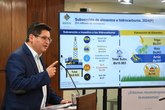 “La subvención tanto a hidrocarburos y alimentos, va más allá de los 10.503 millones de bolivianos”, dijo la autoridad gubernamental, en conferencia de prensa, desde su despacho, en la ciudad de La Paz.