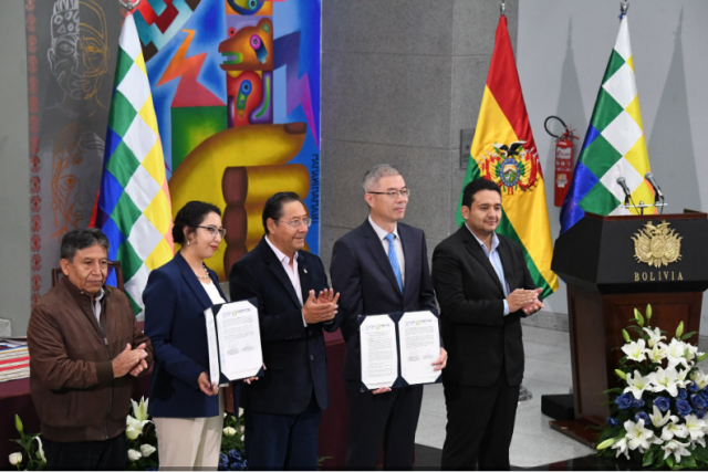 En el acto también estuvo presente el vicepresidente David Choquehuanca, autoridades nacionales y locales. Y el convenio fue suscrito por la presidenta ejecutiva de YLB, Karla Calderón, y el representante legal del consorcio chino CBC, Qinghua Zhou.