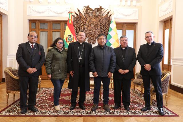El presidente en ejercicio del Estado boliviano, David Choquehuanca, se reunió esta jornada con representantes de la Conferencia Episcopal de Bolivia (CEB) para abordar temas relaciones al ámbito educativo.