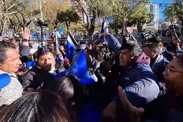 Mientras de desarrolla el ‘Encuentro Multipartidario e Interinstitucional por la Democracia’ convocado por el Tribunal Supremo Electoral (TSE), en afueras del edificio del TSE, la plaza Abaroa se convirtió en un “ring” para el enfrentamientos entre los militantes de las alas “evistas” y “arcistas” del Movimiento al Socialismo (MAS).
