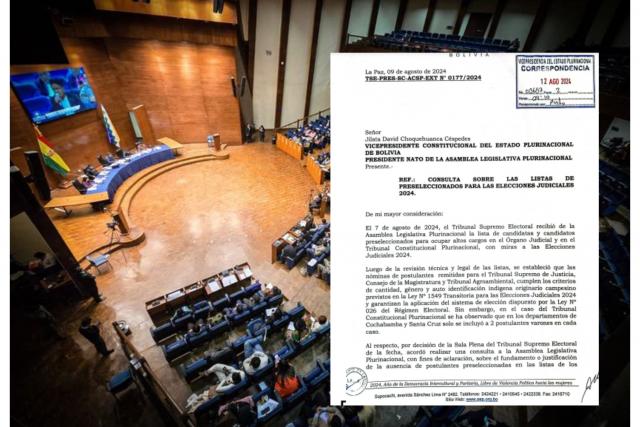 “Por decisión de la sala plena del Tribunal Supremo Electoral de la fecha, acordó realizar una consulta a la Asamblea Legislativa Plurinacional, con fines de aclaración, sobre el fundamento o justificación de la ausencia de postulantes preseleccionadas en las listas de los departamentos de Cochabamba y Santa Cruz para el Tribunal Constitucional Plurinacional, para que con su respuesta el Órgano Electoral Plurinacional considere proseguir con la organización y administración de las Elecciones Judiciales 2024 en el marco de la normativa vigente”, señala la carta.