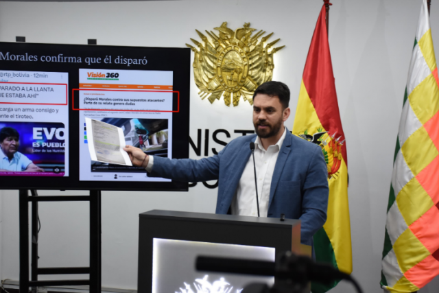 En conferencia de prensa, el ministro de Gobierno, Carlos Eduardo del Castillo, afirmó que Evo Morales huyó de un punto de control en Villa Tunari y desde el auto en el que se transportaba se disparó contra la policía y ese automóvil atropelló a un efectivo antinarcóticos.