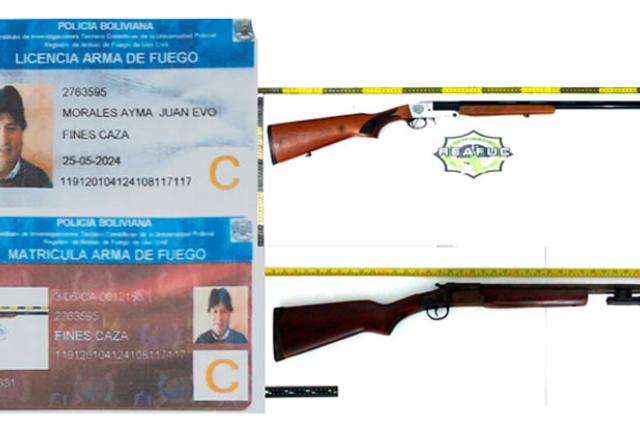Como prueba, la autoridad exhibió el credencial de las armas que tiene registradas Evo Morales, documento que específica que las armas son para fines de caza ya que el dirigente cocalero se dedica a la crianza de animales que son vulnerables a depredadores.