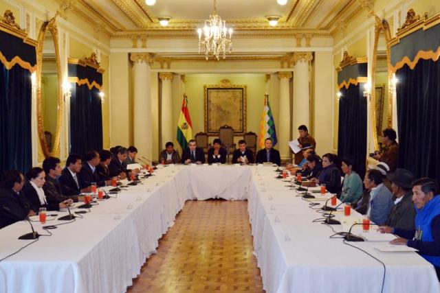 La Paz, 11 de febrero (Oxígeno).- La primera sesión de debate sobre el pacto fiscal a cargo del Consejo Nacional de Autonomías concluyó hoy con el objetivo de trabajar sobre la base de cinco puntos. El presidente Evo Morales entregó a cada uno la propuesta de oficial de trabajo para definir el pacto fiscal  para que en un segundo encuentro se debata los planteamientos departamentales.
