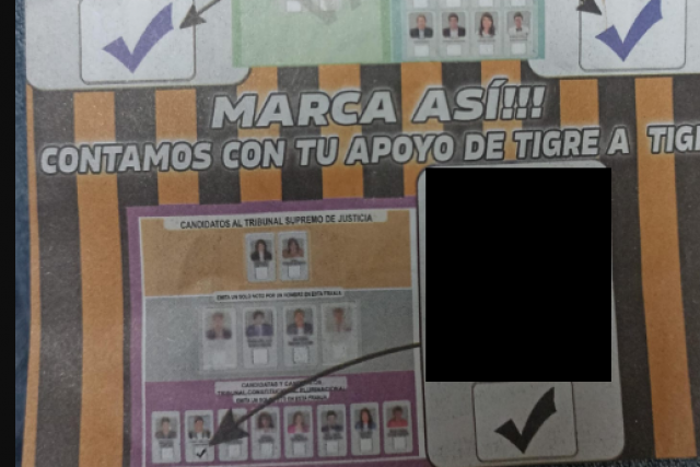 “Marca así. Contamos con tu apoyo de Tigre a Tigre”, señala una de las propagandas impresas a favor de tres candidatos: uno al Tribunal Agroambiental, uno al Consejo de la Magistratura y otro al Tribunal Supremo de Justicia (TSJ).