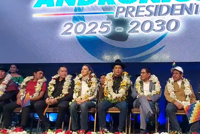 El actual Presidente del Senado y la exministra de Planificación fueron presentados en un acto desarrollado en el Hotel Europa de La Paz, en el que estuvieron acompañados por Félix Patzi, líder de la alianza, y con la participación de representantes de algunas organizaciones sociales que, previa a la presentación, marcharon en la Sede de Gobierno en respaldo a Andrónico Rodríguez.