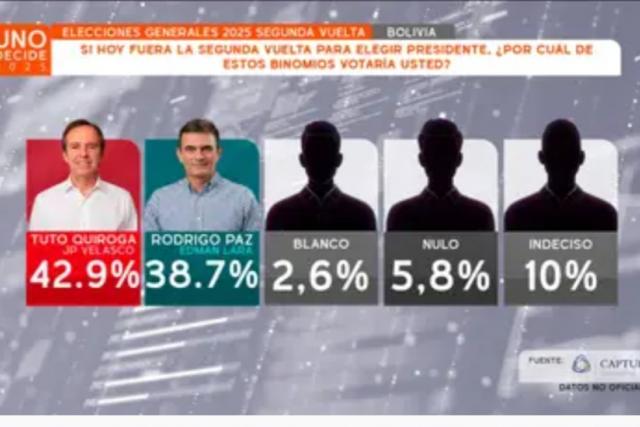 La encuesta presentada por Unitel dabaa cuenta que el candidato a la presidencia por la Alianza Libre, Jorge Tuto Quiroga, superaba a su contrincante, Rodrigo Paz del Partido Demócrata Cristiano (PDC), por 7,7 puntos porcentuales.
