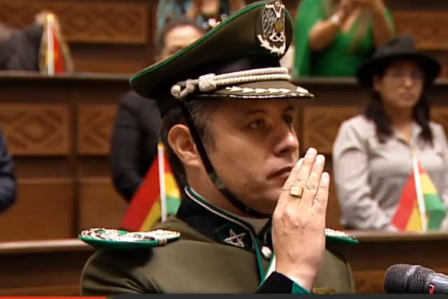 Tal y como lo prometió, Edmand Lara viste el uniforme policial para jurar a la vicepresidencia del Estado boliviano.