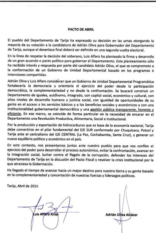 Tarija, 19 de abril (Oxígeno).-  El candidato de Unidad Departamental Autonomista (UD-A) para la Gobernación tarijeña, Adrián Oliva, suscribió un acuerdo con Luis Alfaro de la agrupación política Tarija para Todos (TPT), rumbo a la segunda vuelta que se llevará a cabo el 3 de mayo.