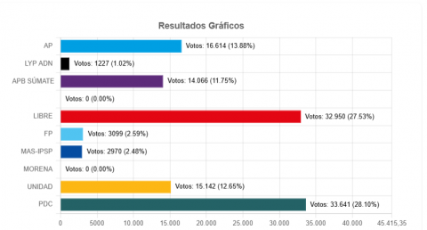 Oruro, Tarija, Chuquisaca, Pando y Potosí ya concluyeron el conteo de votos. Según el avance del resto de los departamentos, se va confirmando que Rodrigo Paz (PDC) ganó en La Paz, Chuquisaca, Cochabamba, Oruro y Potosí. Jorge Tuto Quiroga (Libre) en Santa Cruz y Pando; y Samuel Doria Medina (Alianza Unidad), en Tarija y Beni.
