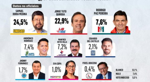 Según los resultados difundidos por el diario cruceño, Samuel Doria Medina (Alianza Unidad) continúa liderando la preferencia electoral, con un 24,5%; empero, sigue siendo seguido de cerca por Jorge Tuto Quiroga (Libre), que llega al 22,9%.