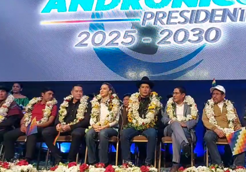 El actual Presidente del Senado y la exministra de Planificación fueron presentados en un acto desarrollado en el Hotel Europa de La Paz, en el que estuvieron acompañados por Félix Patzi, líder de la alianza, y con la participación de representantes de algunas organizaciones sociales que, previa a la presentación, marcharon en la Sede de Gobierno en respaldo a Andrónico Rodríguez.