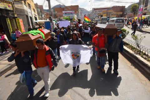 Los cuerpos de los dos cocaleros son velados en la sede de la Asociación Departamental de Productores de Coca (Adepcoca), ubicada en la zona de Villa Fátima de la ciudad de La Paz.