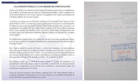 El Senado señaló que se denunció a un exfuncionario porque falsificó su título. Aclara que el depósito que hizo el acusado fue para resarcir los daños; no obstante, el Fiscal rechazó el proceso abreviado.