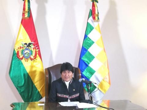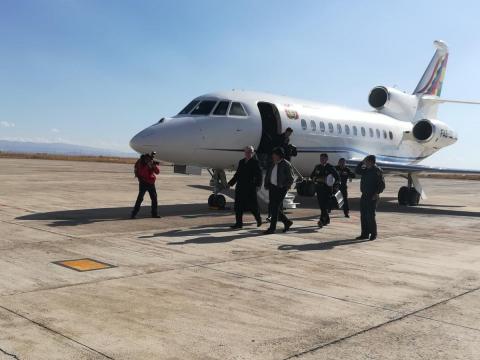 El primer mandatario fue recibido por el vicepresidente Álvaro García Linera, miembros del gabinete ministerial y representantes de las organizaciones sociales.
