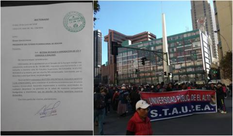 El Rector de la UPEA, además, reitera la “voluntad de reiniciar el diálogo” con las autoridades gubernamentales “sin condiciones” y responsabiliza al Gobierno “por cualquier desenlace no previsto en la salud de nuestros compañeros huelguistas y marchistas”.