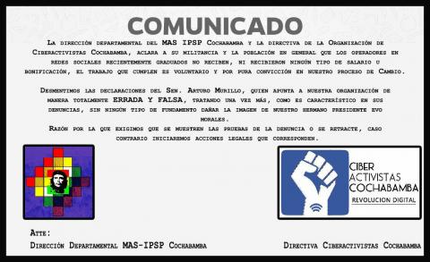 “La Dirección del MAS aclara a su militancia y la población en general que los operadores en redes sociales recientemente graduados no reciben ni recibieron ningún tipo de salario o bonificación, el trabajo que cumplen es voluntario y por pura convicción en nuestro proceso de cambio”, señala el comunicado del MAS.