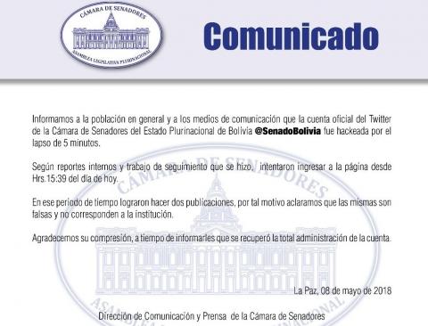 “Lamentamos el fallecimiento de nuestro presidente Evo Morales. Nuestras condolencias a su familia y personas más cercanas”, señalaba el tuit falso que se publicó mediante el Twitter del Senado, adjuntando una foto del Presidente.