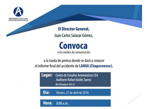 El Director General de la Aeronáutica Civil de Colombia convocó a una rueda de prensa para presentar el informe final del accidente de la aerolínea Lamia.
