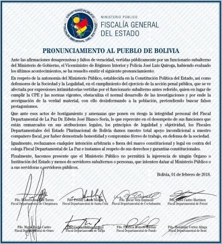 Rechazan la injerencia externa en el desempeño del trabajo de la Fiscalía y acusan a Quiroga de 'obstaculizar el desarrollo normal de las investigaciones".