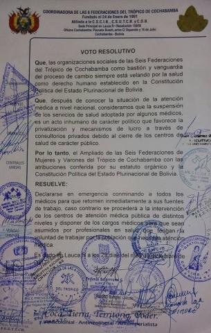 Los cocaleros del Trópico calificaron el paro médico como un acto inhumano.