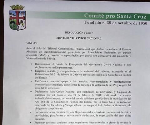 El Comité Pro Santa Cruz convoca a un paro cívico nacional para el 21 de febrero de 2018 en rechazo al fallo del Tribunal Constitucional Plurinacional (TCP) que habilita a Evo Morales para las elecciones del 2019 y pidiendo “respeto del voto del 21 de febrero”, señala su...