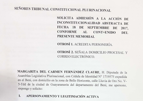 Margarita Fernández presentó al TCP un memorial solicitando su adhesión a la acción abstracta presentada el 18 de septiembre que busca la repostulación.