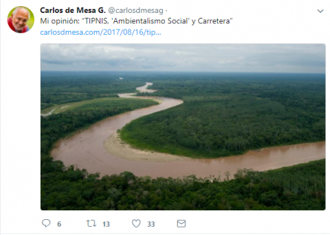 Carlos Mesa señaló que la carretera entre Beni y Cochabamba que él mpulsó tenía un trazo fuera del Tipnis y acusó al Gobierno de plantear un “falso debate”.