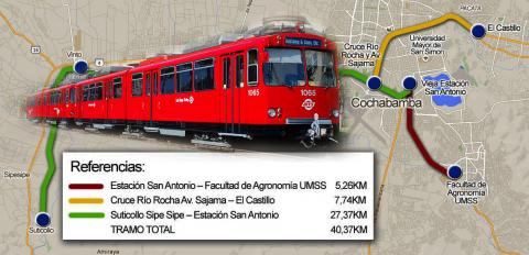 El tren atravesará los municipios de Sipe Sipe, Vinto, Quillacollo, Cercado, Colcapirhua y Sacaba, tendrá 43 paradas, 12 trenes, tranportará a 200 personas a 80 k por hora.