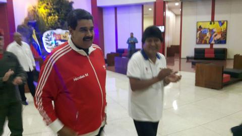Morales visitó Venezuela, donde le aseguró al presidente Maduro: "Si algo pasa en Venezuela están todos los pueblos de América Latina para defender esta revolución".