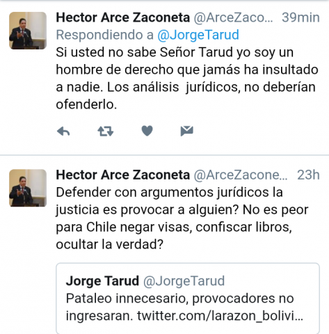 Todo comenzó hace 23 horas, cuando el ministro de Justicia y Transparencia, Héctor Arce, respondió al tweet del diputado chileno Jorge Tarud, quien escribió "Venir a Chile a insultar ha sido tónica permanente de ustedes los ministros, pueblo boliviano es bienvenido, ustedes no" haciendo referencia a las declaraciones de Arce ante la negativa de otorgar visas a autoridades bolivianas.