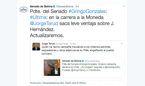 El presidente del Senado Boliviano, Luis Alberto Gonzáles, usó la cuenta oficial del Senado para intercambiar "criterios" con el diputado chileno Jorge Tarud esta tarde.