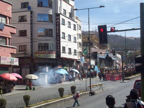 A pesar de que el uso de dinamita está prohibido por la Ley 400 de Control de armas, los trabajadores marcharon por el centro de la ciudad marcando su paso con las explosiones que provocaron tensión y angustia entre los paceños.