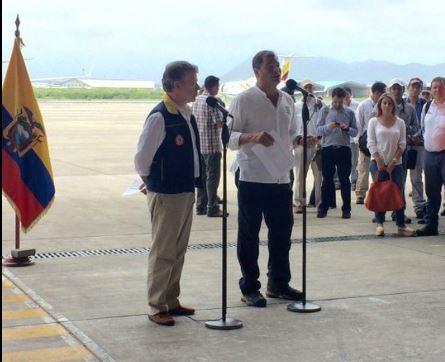 El presidente Correa recibió la visita del presidente Santos de Colombia quien llegó con ayuda humanitaria.