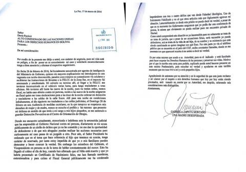 En una misiva Zapata relata que se encuentra atemorizada e indefensa ante la arremetida judicial que ha emprendido el Gobierno en su contra. Además, cuenta que tiene un hijo en “común” con el presidente Evo Morales.