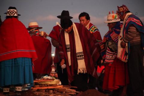 Morales, junto al vicepresidente Álvaro García Linera, llegó a Tiahuanaco, aproximadamente a las 5.30, para participar de una ceremonia ancestral a cargo de un grupo de amautas, que agradeció a la Pachamama por la administración del Presidente.