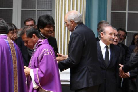 Hoy, Carlos Mesa y Evo Morales coincidieron en la misa de cuerpo presente del fallecido excanciller Armando Loaiza en instalaciones del Ministerio de Relaciones Exteriores.